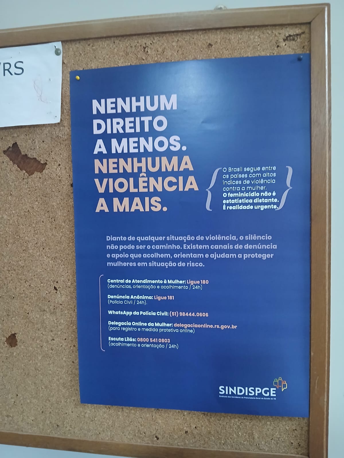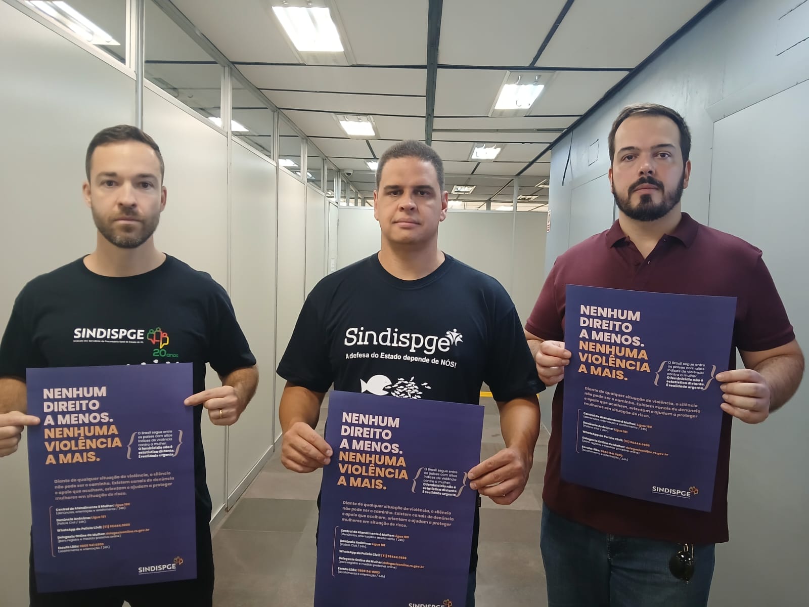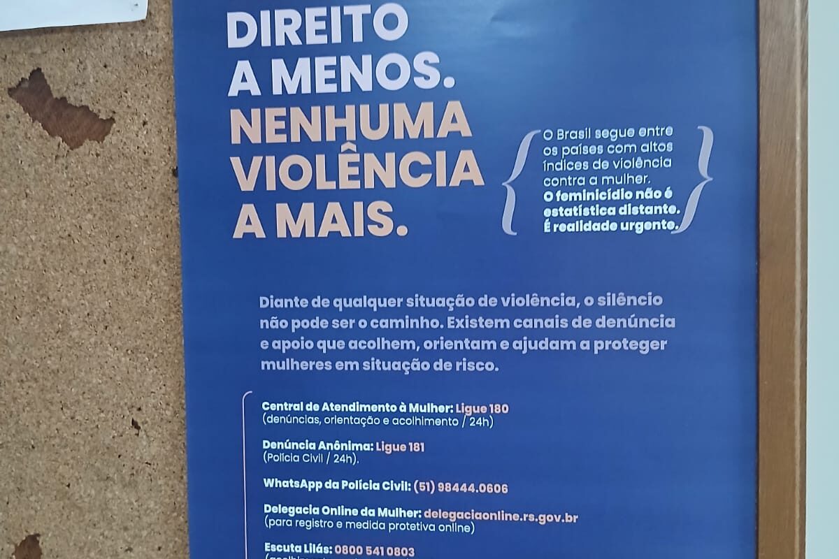 Os cartazes foram afixados em diversas procuradorias com a divulgação de contatos de canais de denúncia e apoio – que acolhem, orientam e ajudam mulheres em situação de risco.